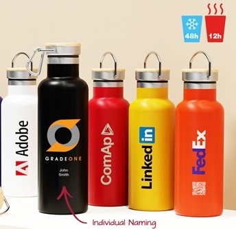 Garrafas térmicas personalizadas com nomes individuais elevam o brinde corporativo para nível pessoal.