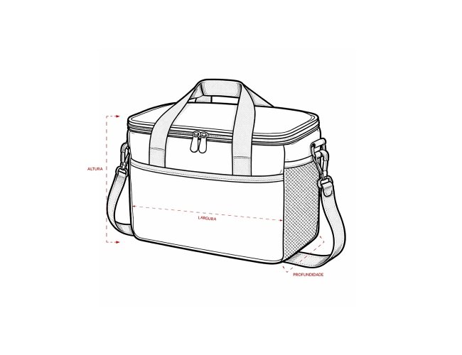 Bolsa térmica confeccionada em couro sintético a partir do PVC impermeável, com capacidade máxima de 12 Litros e revestimento interno em filme de alumínio, que mantém a temperatura de alimentos e bebidas por mais tempo. Possui alças de mão costuradas em poliéster, além de um par de argolas plásticas para engate de alça e três bolsos externos abertos, sendo dois em tela de malha com elástico. Acompanha alça transversal ajustável.