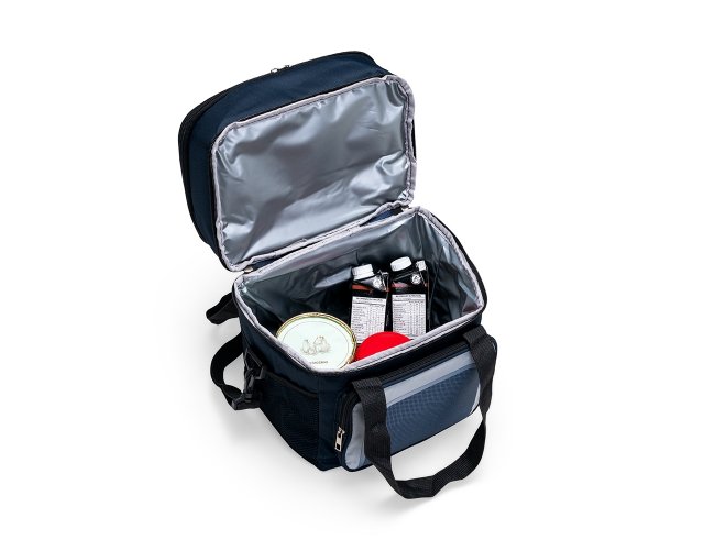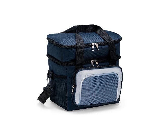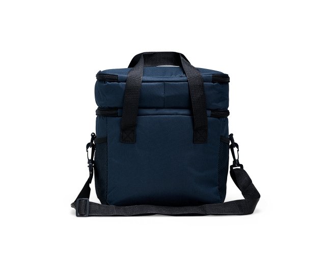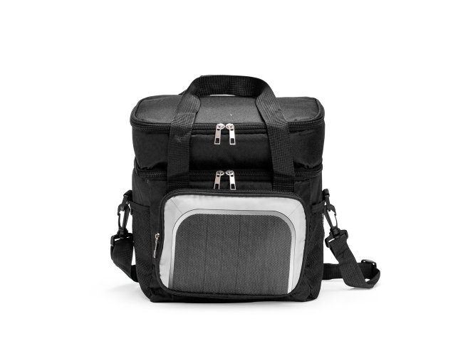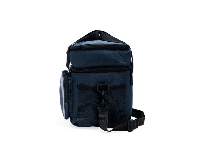 Bolsa térmica em Oxford 600D resistente à água e estrutura interna em espuma. Possui dois compartimentos térmicos com capacidade total de até 12 litros, sendo o superior com revestimento em alumínio e bolso interno em tela com elástico, enquanto o inferior apresenta revestimento em PEVA antivazamento. Conta também com bolso frontal com fechamento em zíper, dois bolsos em tela de nylon com elástico e duas alças de mão costuradas. Acompanha alça transversal ajustável.