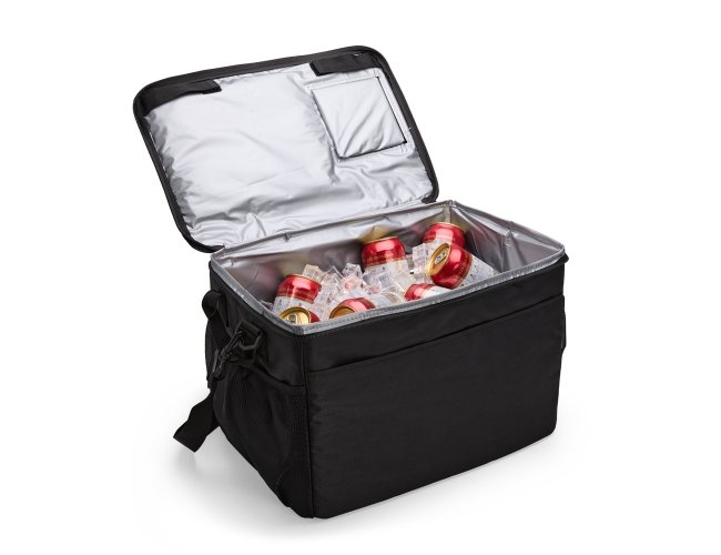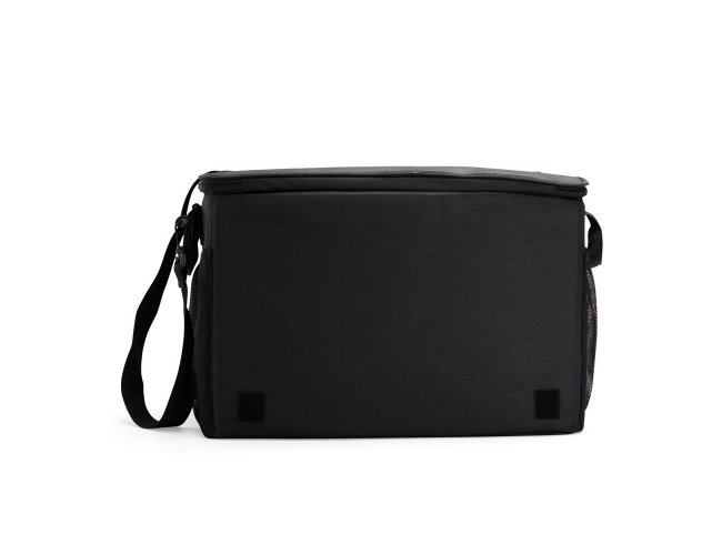 Bolsa térmica produzida em nylon balístico 840D com proteção hidrorrepelente e volume interno para 33 litros. Dispõe de isolamento térmico em PEVA de grau alimentício, armação dobrável de alta densidade e cobertura sólida em polipropileno com cavidades para bebidas e bocal de acesso rápido por velcro. Apresenta três divisórias externas: uma frontal com trava de contato e duas laterais em malha de nylon com bordas elásticas. Inclui bandoleira transversal regulável com proteção acolchoada para o ombro.