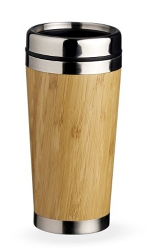 Copo Bambu de 500ml, parte interna em inox. Possui tampa com compartimento que pode ser aberto para beber.