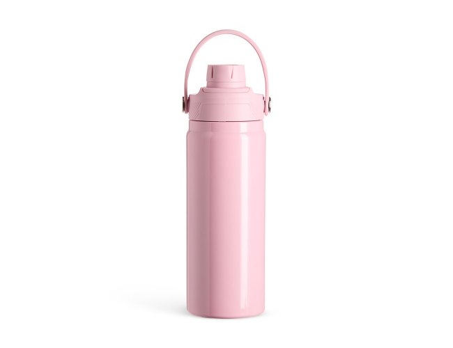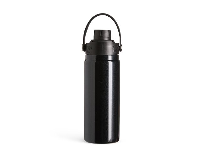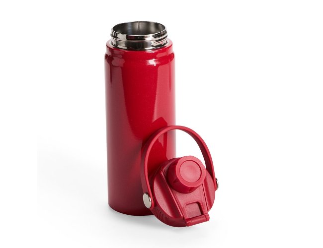 Garrafa térmica em inox com capacidade de até 600ml. Apresenta estrutura com parede dupla e isolamento a vácuo, permitindo conservar a temperatura de líquidos por mais tempo. Possui tampa plástica rosqueável com proteção para o bocal e alça fixa para transporte.