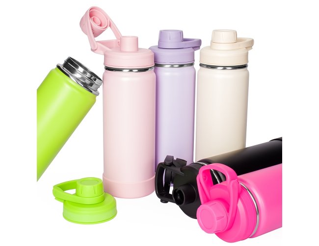 Garrafa térmica em inox com pintura eletrostática e capacidade de até 550ml. Mantém a temperatura de líquidos por mais tempo graças à estrutura de parede dupla e ao isolamento a vácuo. Possui tampa plástica rosqueável com protetor de bocal e alça fixa. Acompanha protetor removível em silicone para a base.