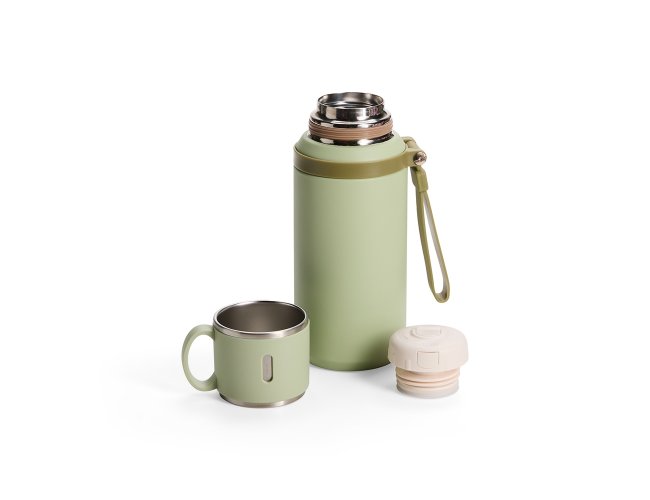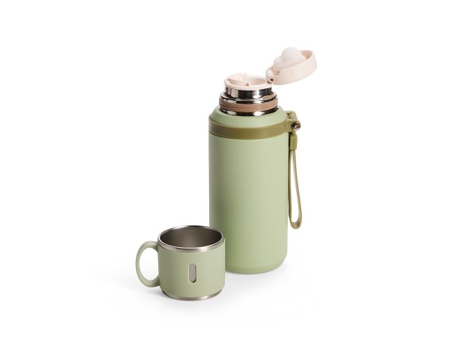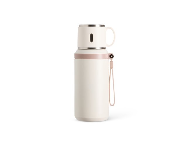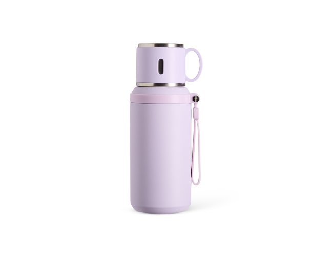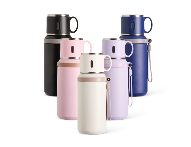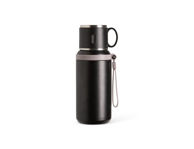 Garrafa térmica em inox com pintura eletrostática e capacidade de até 600ml. Possui estrutura de parede dupla e tampa interna rosqueável com anel de vedação, abertura do bocal por botão de acionamento e infusor. Conta ainda com tampa externa em formato de caneca e alça emborrachada para transporte.