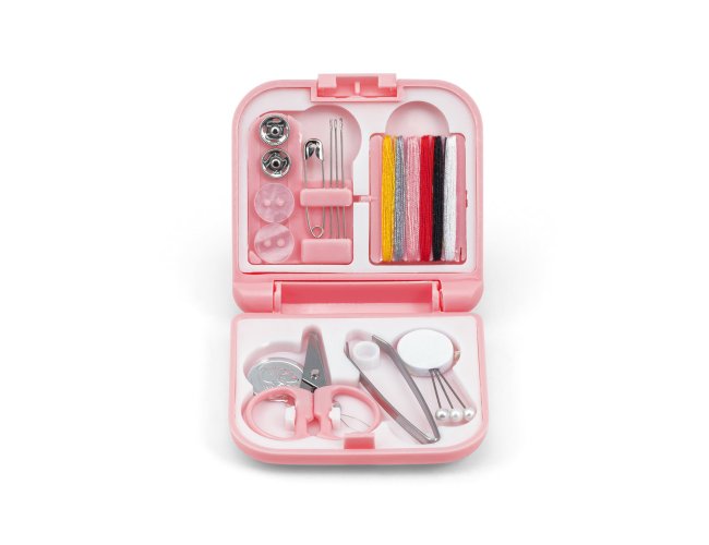 Kit de costura prático e leve para levar em viagem. Composto por 3 alfinetes, 3 agulhas, 1 pinça, 1 tesoura, 1 enfia linha, 1 alfinete, 2 botões, 2 colchetes e 6 rolos de linhas de várias cores. Fornecido em estojo. 70 x 21 x 65 mm
